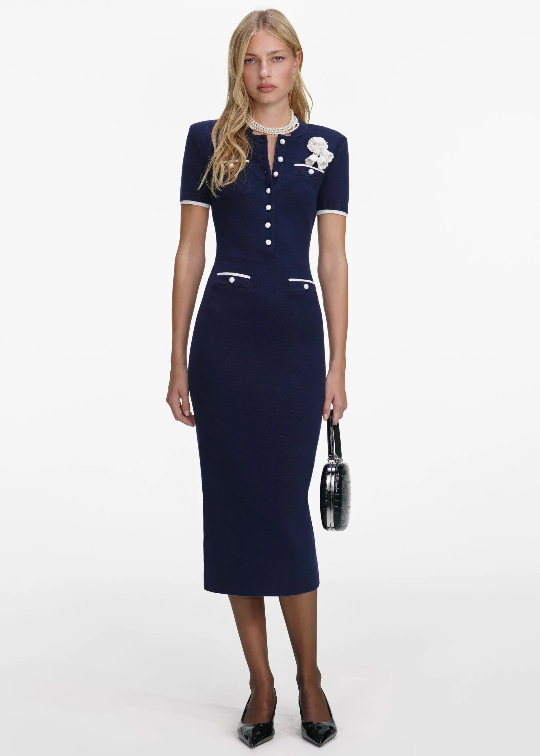 Çiçek Detaylı Lacivert Midi Triko Elbise