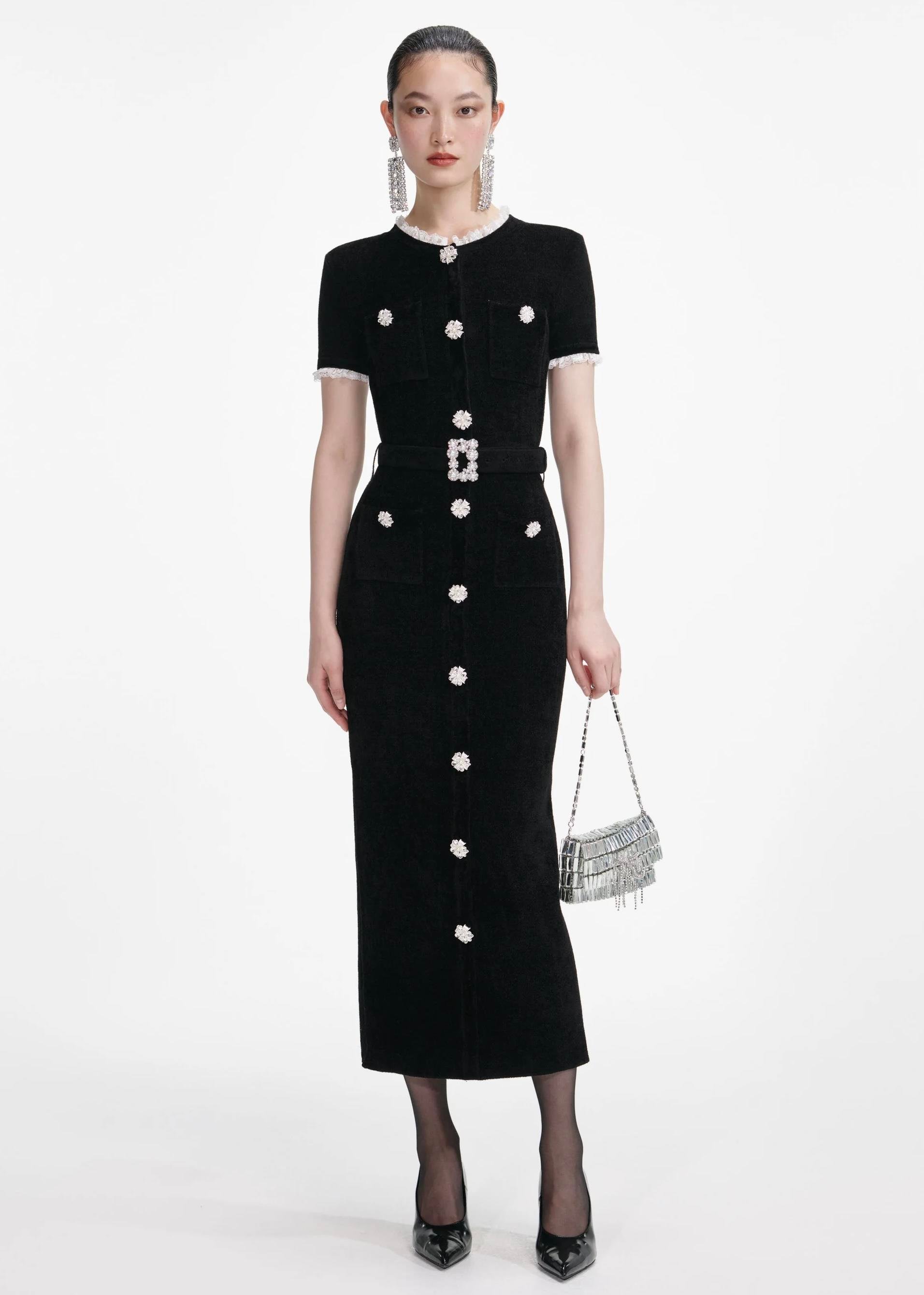Kristal Düğmeli Siyah Midi Elbise