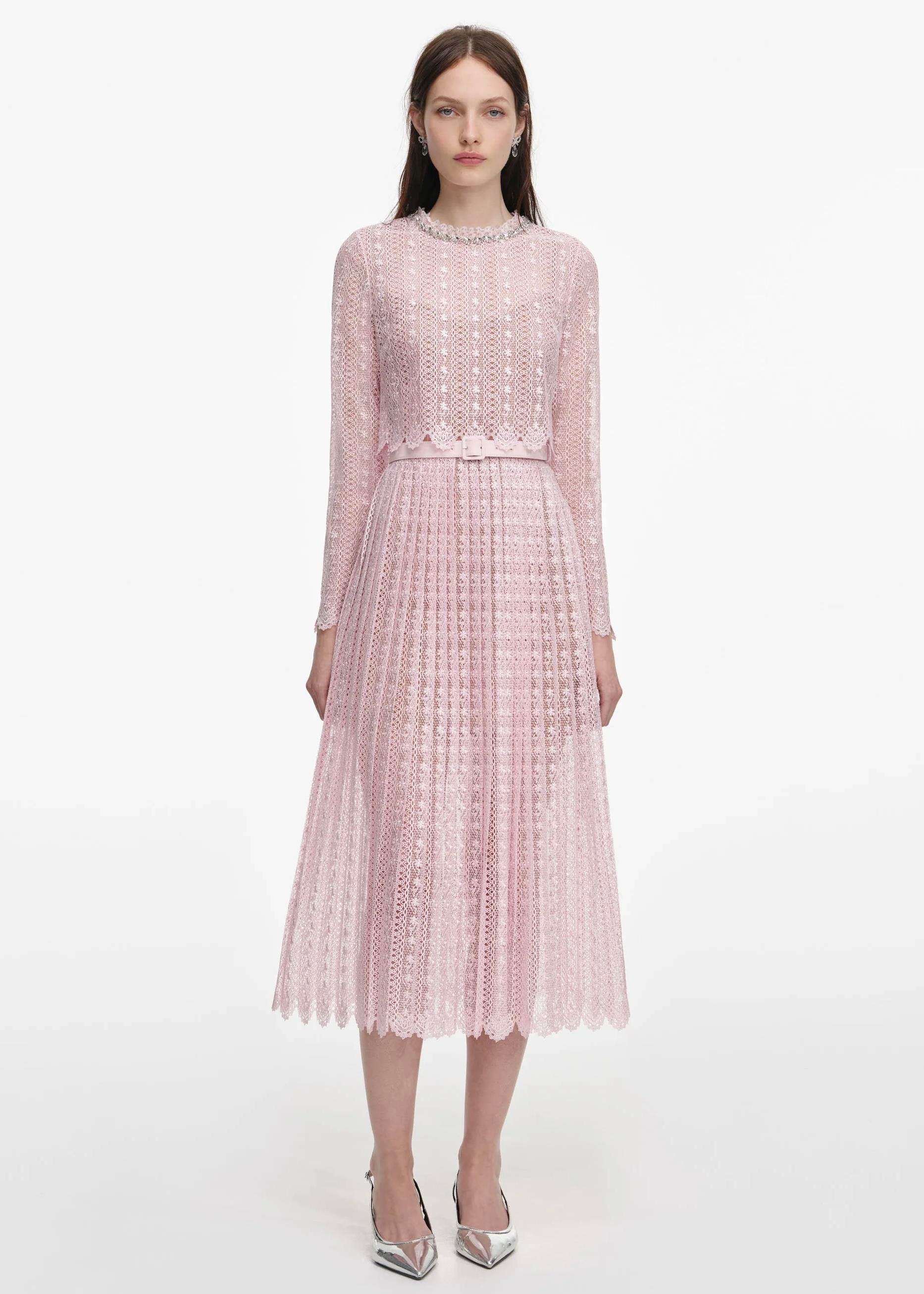 Kristal Taşlı Kemerli Pembe Güpür Midi Elbise