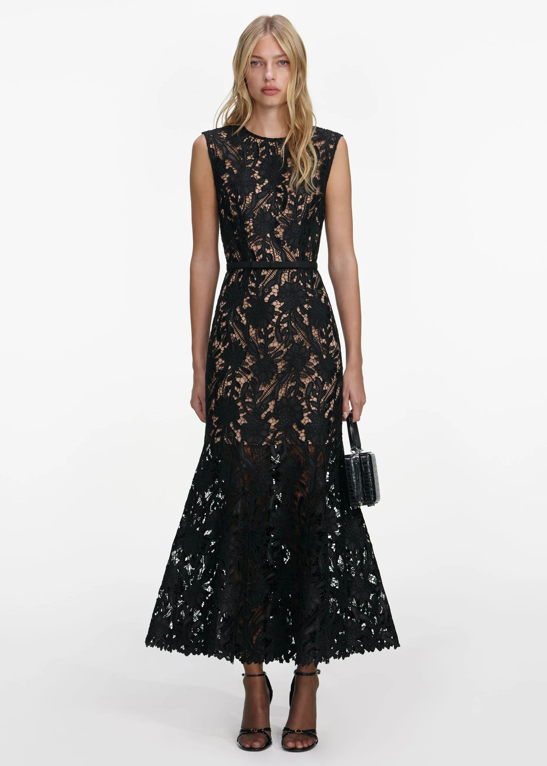 Üç Boyutlu Dantelli Siyah Midi Elbise